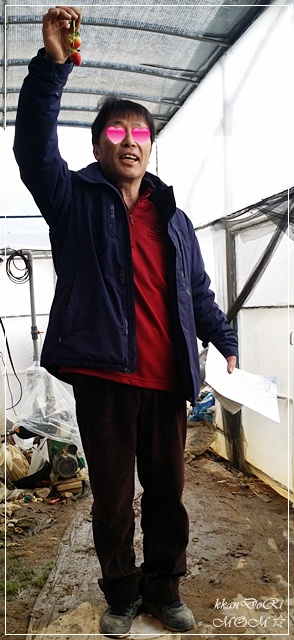 주인아저씨게 부탁하여 딸기밭 앞에서