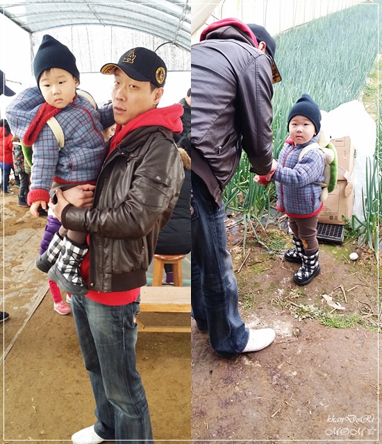 아빠는 깐돌이 안고 딸기 따느랴 바지랑 신발이