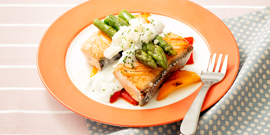 아이들 입맛에도 딱 맞는 연어스테이크. 다양한 채소들을 구워서 함께 먹게 해주세요.