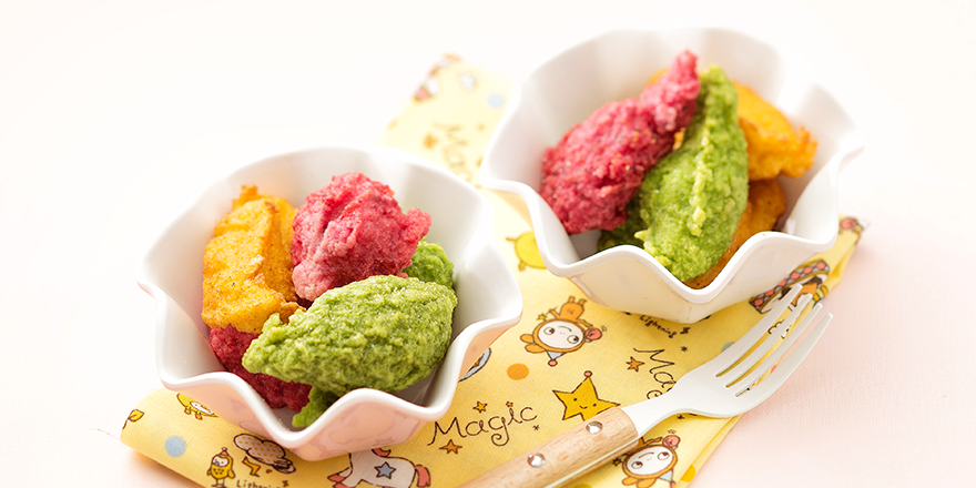 2번의 반죽을 3등분 해서 각각 갈아 놓은 비트, 단호박, 시금치를 넣고 삼색 반죽을 만들어주세요. 전분가루를 조절해 가며 반죽농도를 조절해줍니다. 된 반죽이 아니라 약간 질게 만들어주셔야해요.