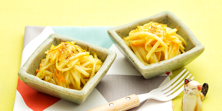 팬에 기름을 조금 두른 뒤 채썬 감자를 넣고 약불에 익혀주세요. 물 한숟가락 넣고 볶으면 잘 익어요.