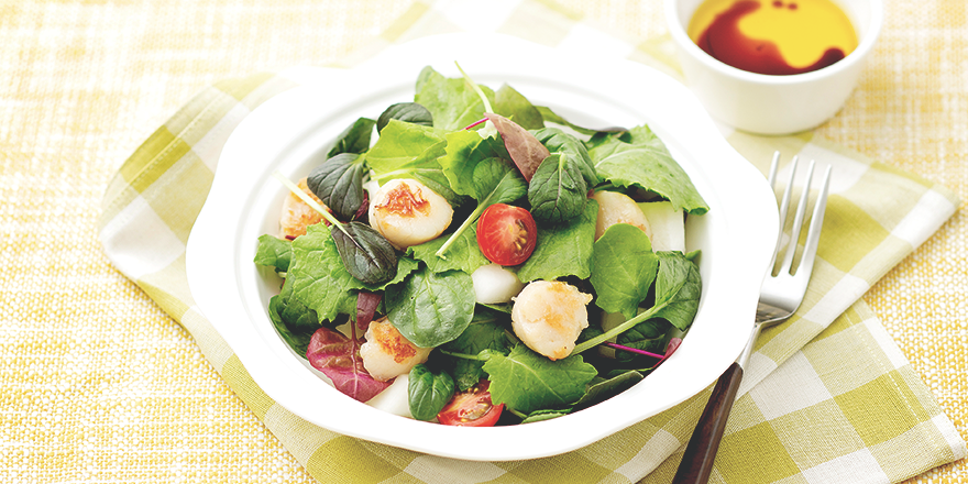 엽산이 가장 풍부한 참외와 지방 함량이 적은 관자, 비타민이 풍부한 어린잎채소가 함께 모인 영양군단 샐러드입니다.