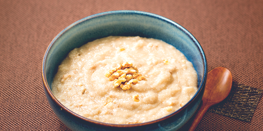 현미와 호두를 곱게 갈아만든 죽으로 아침식사대용 또는 속에 무리를 주지 않는 밤참으로 활용하면 좋습니다.