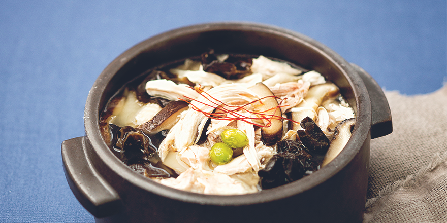 냄비에 대파와 마늘, 버섯불린 물을 붓고 끓으면 닭고기와 청주를 넣고 끓이다가 닭이 다 익으면 대파, 마늘과 함께 건져요.