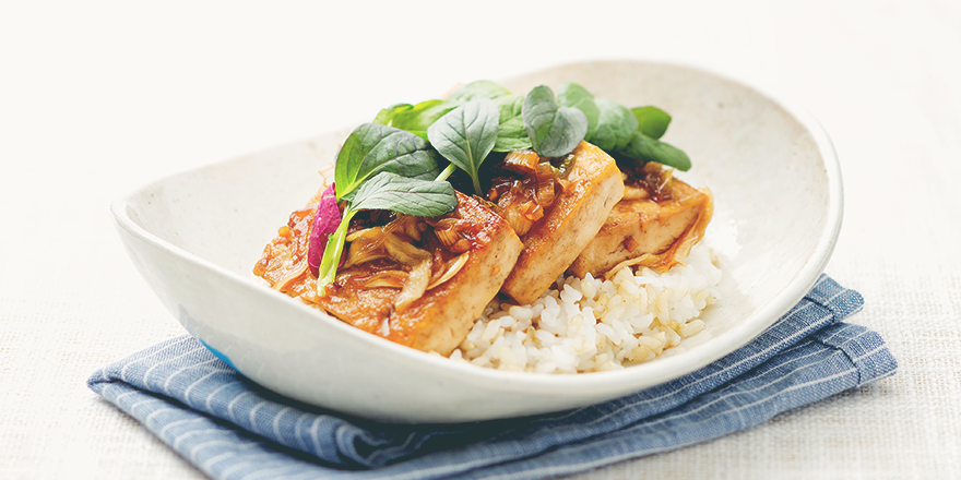 팬의 남은 양념에 준비한 대파와 양파를 넣어 졸여주세요. 그릇에 현미밥을 담고 두부와 5의 채소를 곁들인양념장, 베이비채소를 올리면 완성입니다.