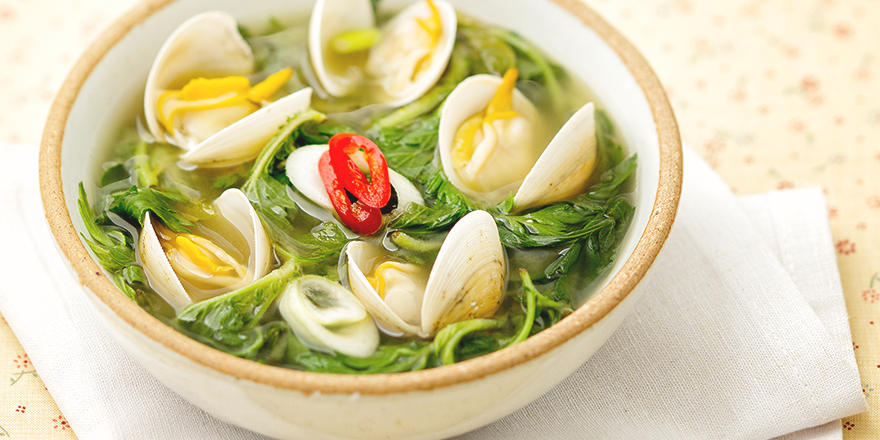 육수에 된장을 풀어 넣고 끓기 시작하면 청고추와 준비한 쑥, 애호박,모시조개을 넣어 끓여요, 쑥이 익으면 대파와 고추를 넣고 소금 간하여 완성합니다.