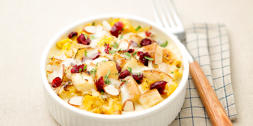 그라탕 용기에 버터로 살짝 코팅해주고, 3을 부어주며 사이사이 준비한 사과를 섞어 주세요. 맨위에 모짜렐라를 토핑해주세요.